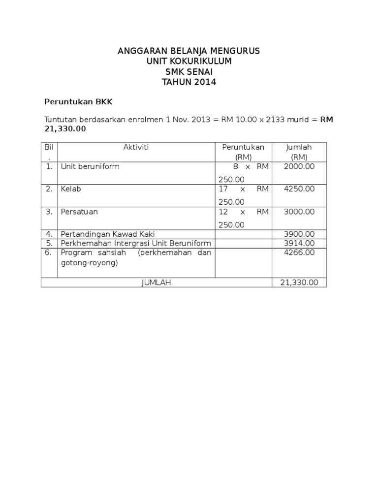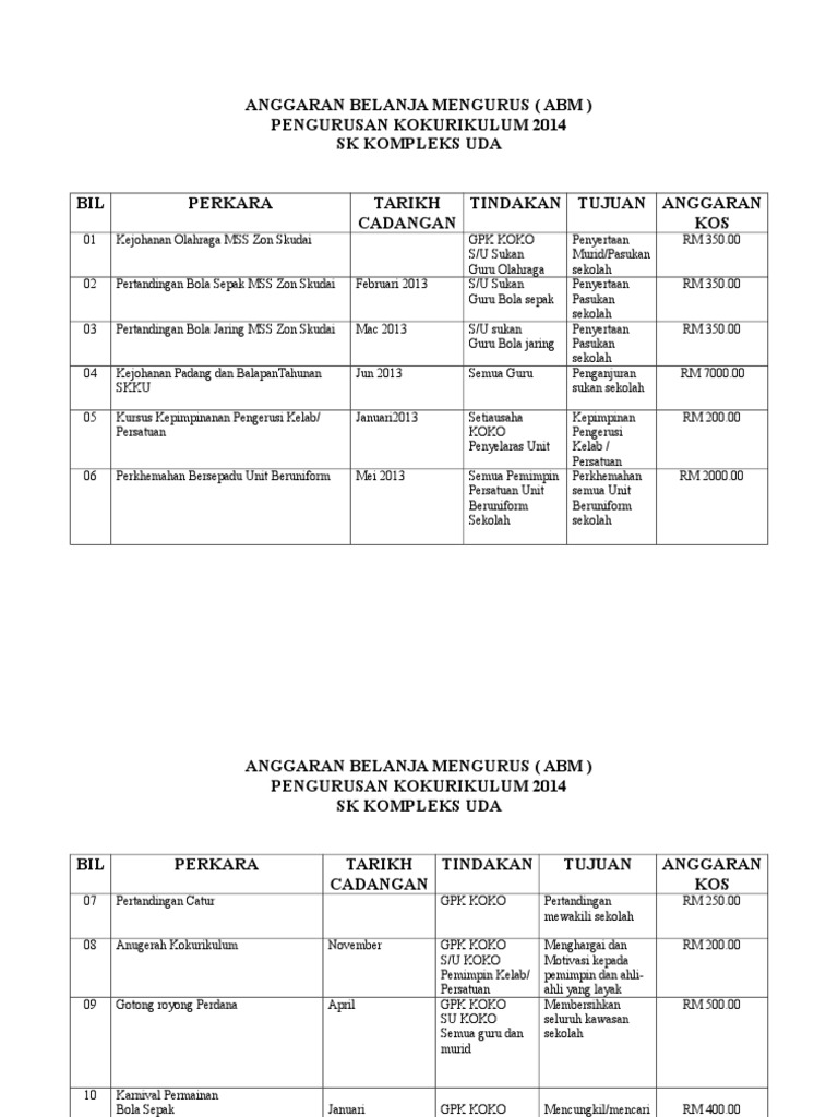 Anggaran Belanja Mengurus Abm Pengurusan Kokurikulum 2014 Sk Kompleks Uda