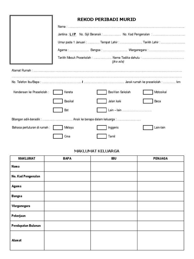 Contoh Borang Maklumat Peribadi Murid Prasekolah
