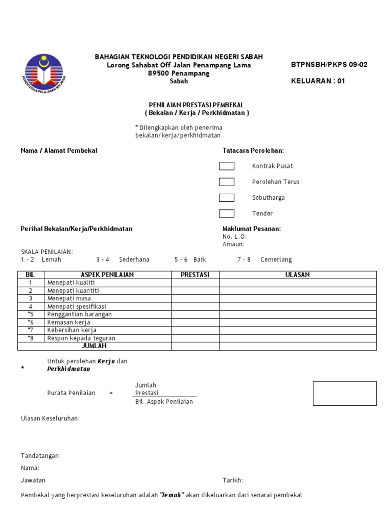 Borang Penilaian Prestasi Pembekal Jabatan Pengajian Tinggi