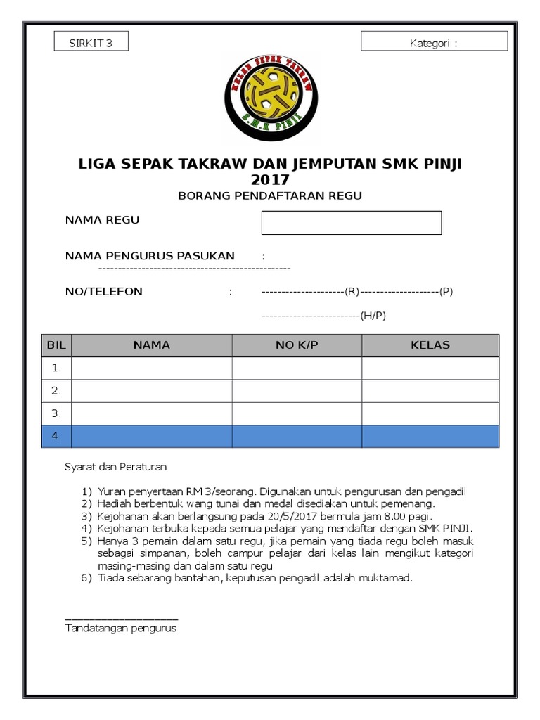 Liga Sepak Takraw Tertutup Smk Pinji 2015 Borang Penyertaan S3