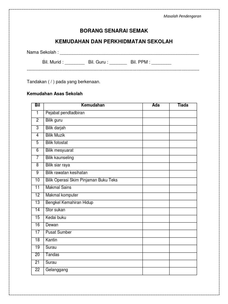 Borang Senarai Semak Kemudahan Dan Perkhidmatan Sekolah