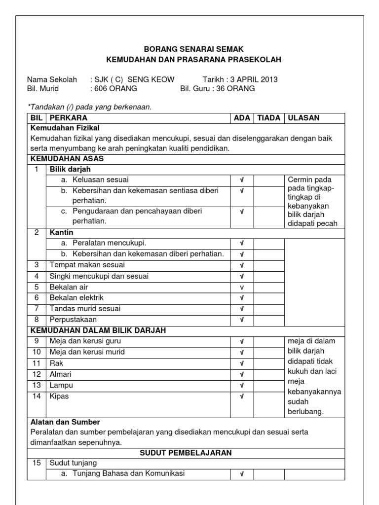Borang Senarai Semak Kemudahan Dan Prasarana