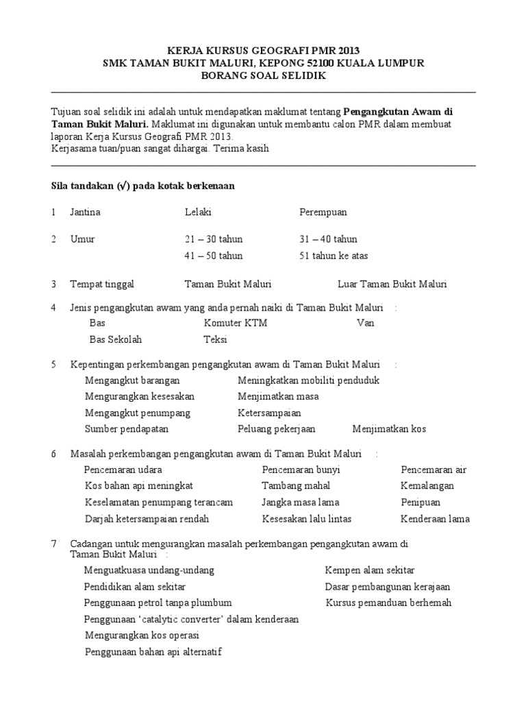Borang Soal Selidik Kerja Lapangan Tugasan Geografi Tingkatan 3 Pengangkutan Bumi Gemilang