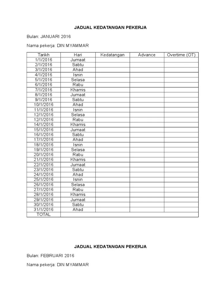 Bulanan Contoh Rekod Kedatangan Pekerja