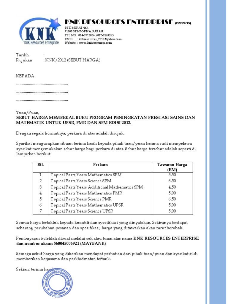 Contoh Surat Jemputan Sebutharga