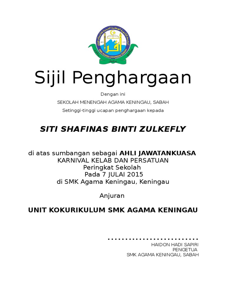 Contoh Sijil Penghargaan Ajk Kelab