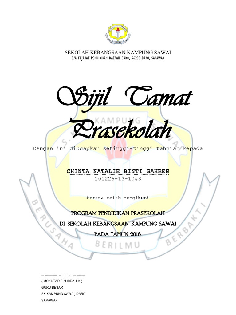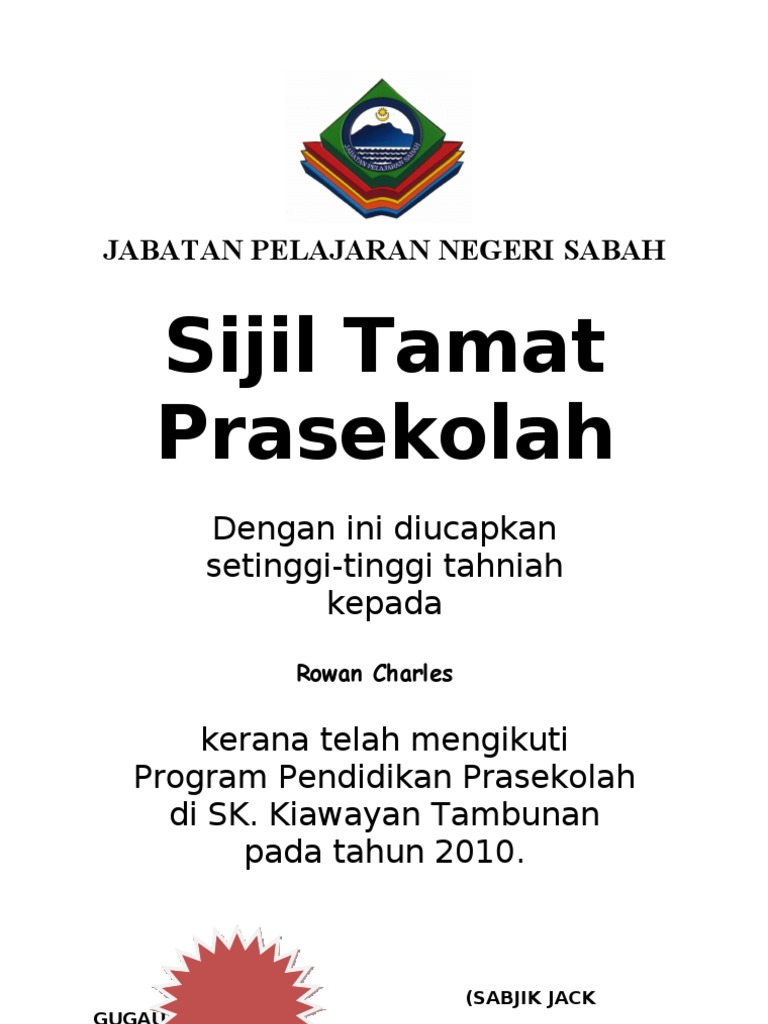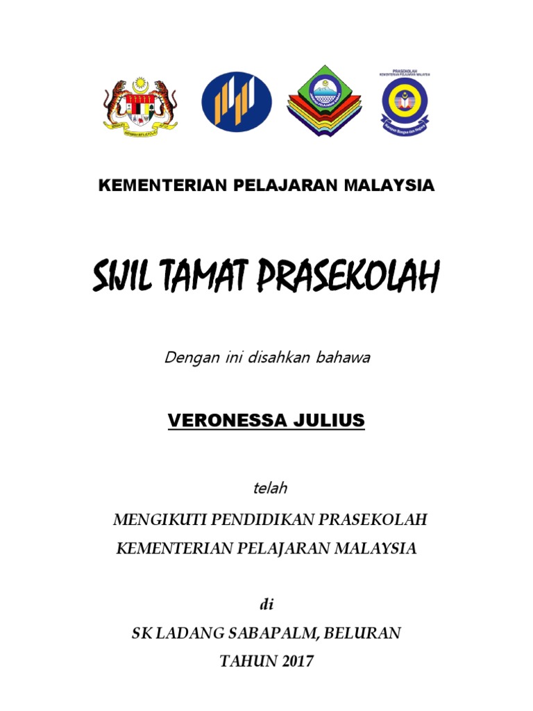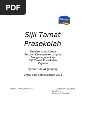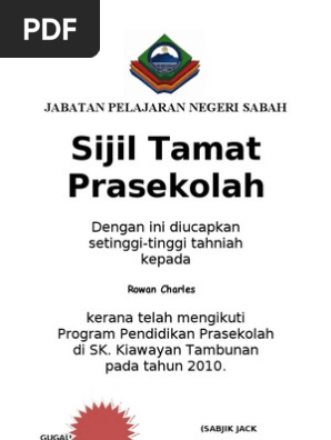 Contoh Sijil Tamat Prasekolah