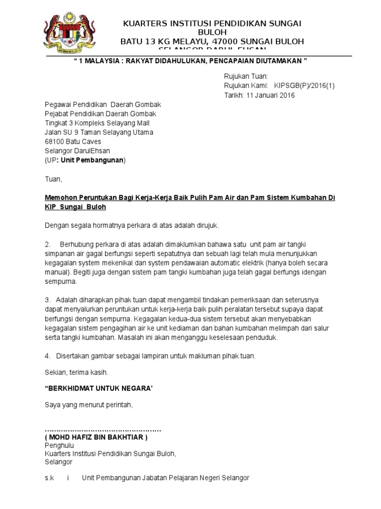 Contoh Surat Aduan Kerosakan Kuarters
