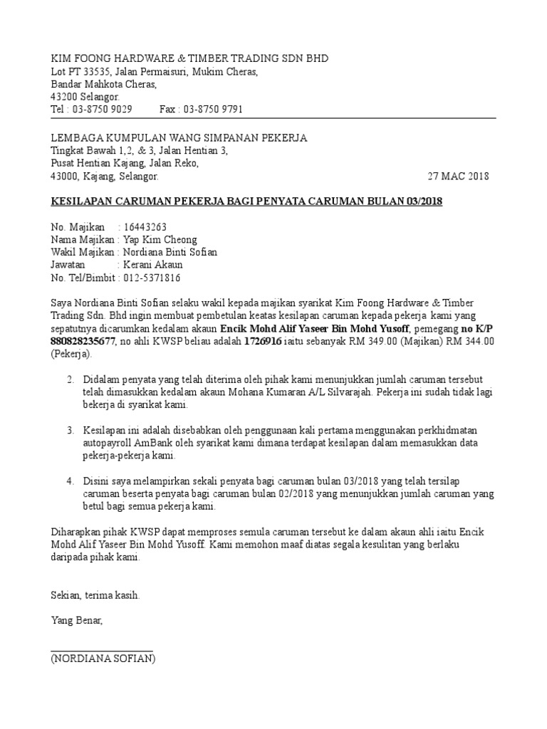 Surat Bertulis Laporan Kesilapan Caruman Kwsp