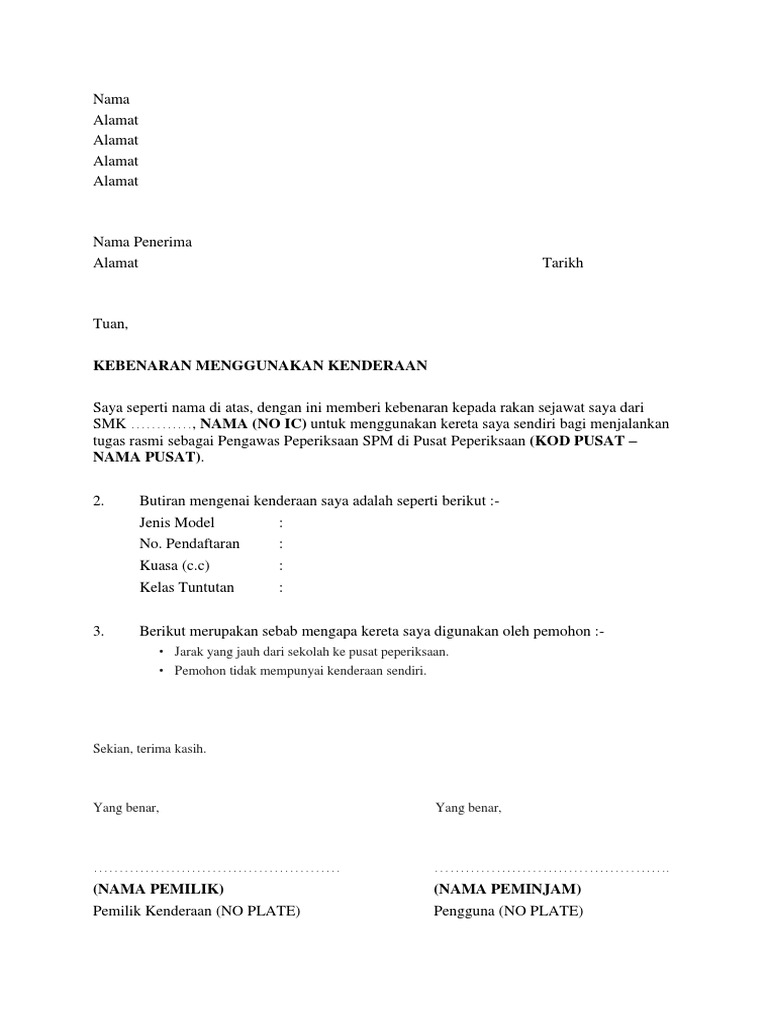 Contoh Surat Kebenaran Penggunaan Kenderaan