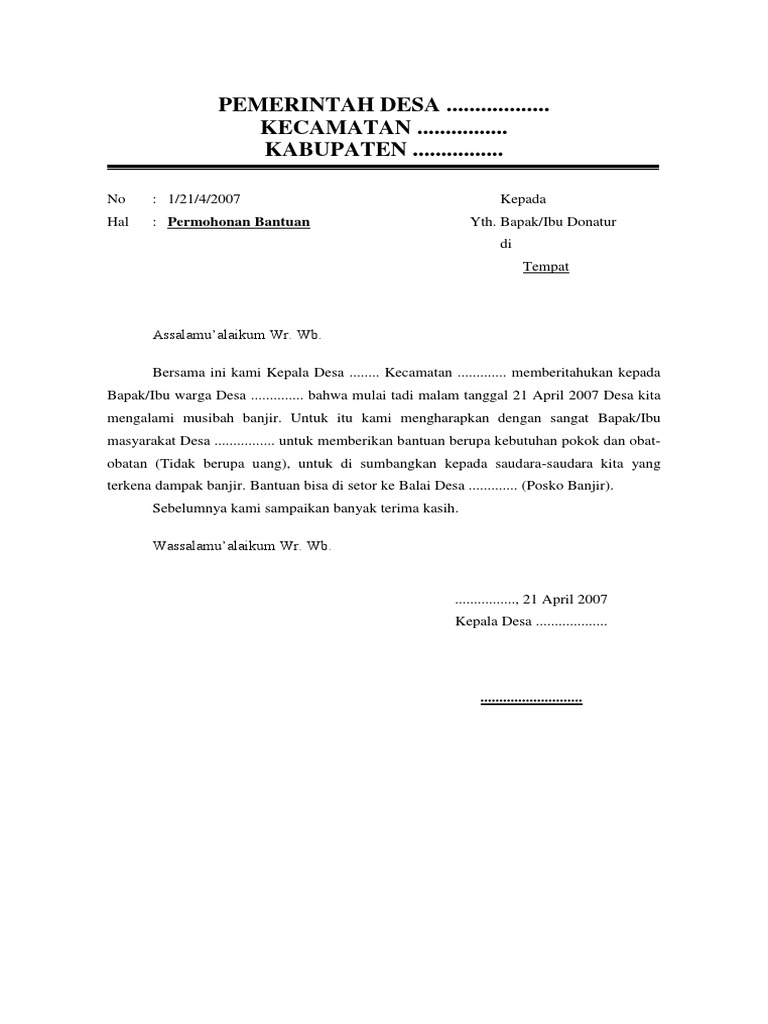 Surat Permohonan Bantuan Bencana Alam Format Administrasi Desa
