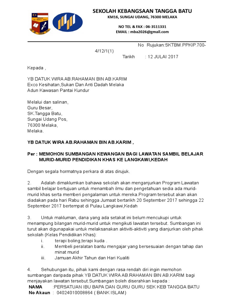 Contoh Surat Rasmi Memohon Sumbangan Yb
