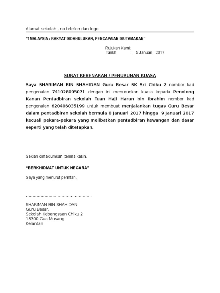 Contoh Surat Penurunan Kuasa Pengetua Kepada Penolong Kanan
