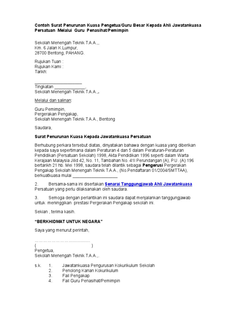 Contoh Surat Penurunan Kuasa Pengetua