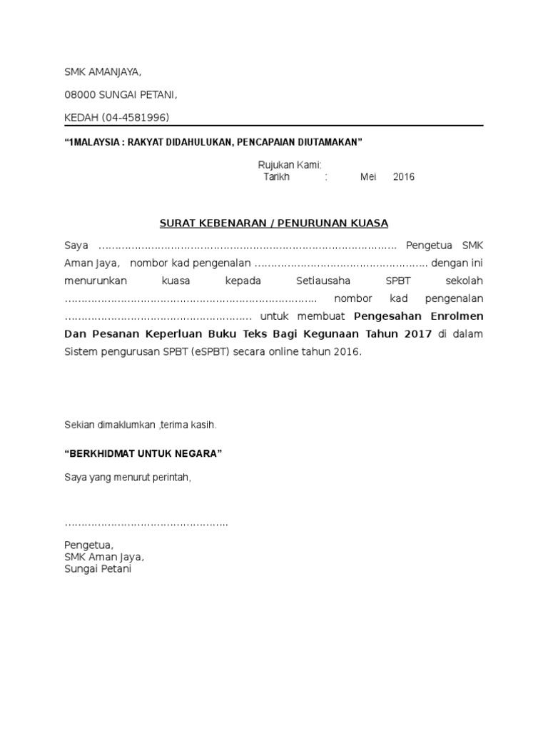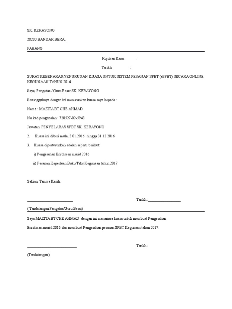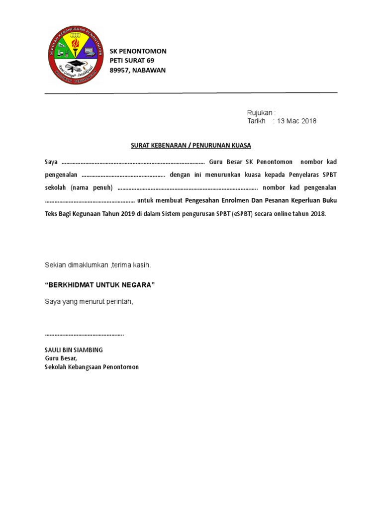 Contoh Surat Turun Kuasa Spbt Sekolah Rendah