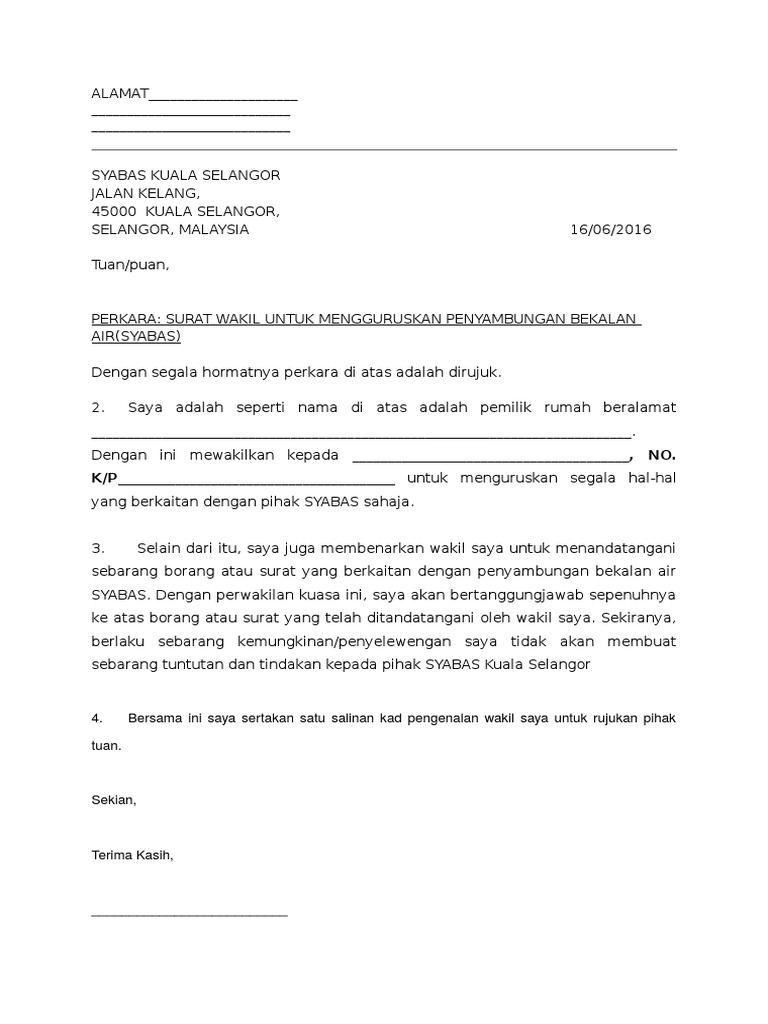 Contoh Surat Permohonan Bekalan Air Syabas