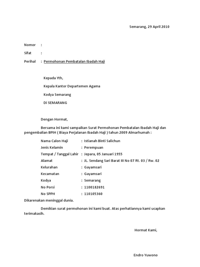 Permohonan Pembatalan Contoh Surat Pembatalan Haji Reguler