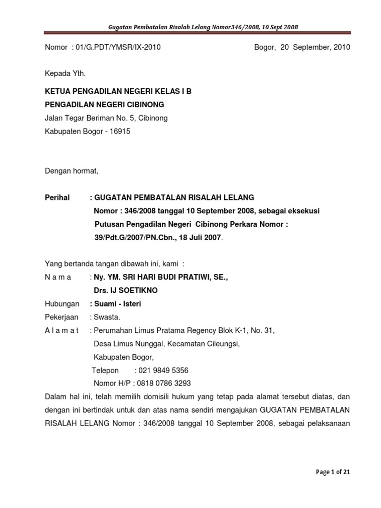 Contoh Surat Gugatan Pembatalan Lelang
