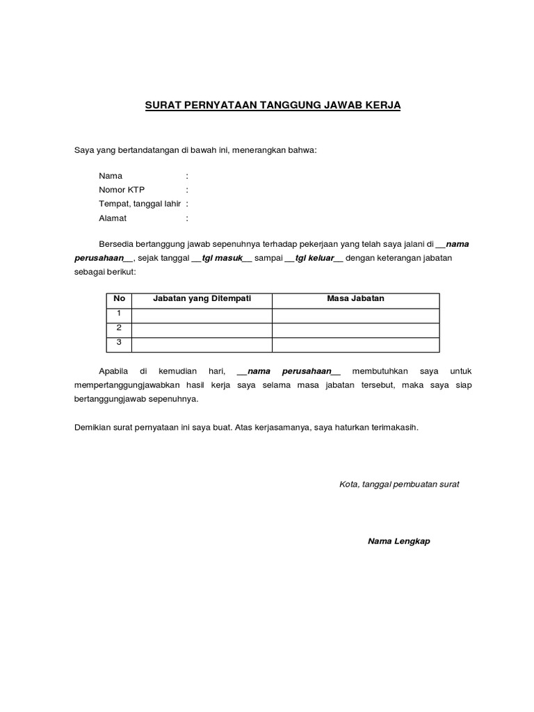 Surat Pernyataan Tanggung Jawab Kerja
