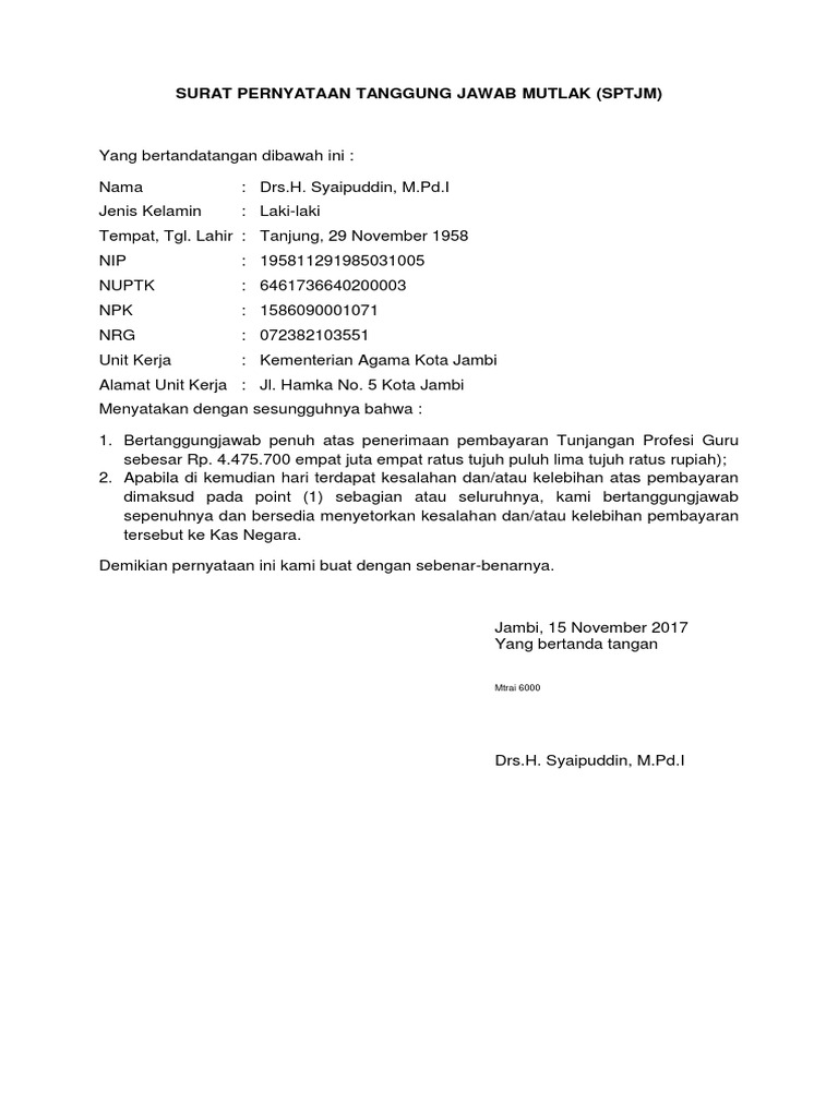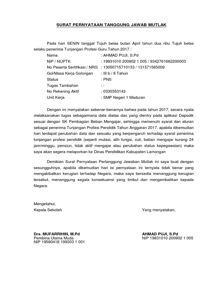 Contoh Surat Pernyataan Tanggung Jawab Mutlak Sptjm Bagi Contoh Surat