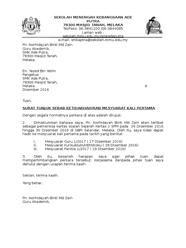 Surat Tunjuk Sebab Tidak Hadir Meyuarat Docx