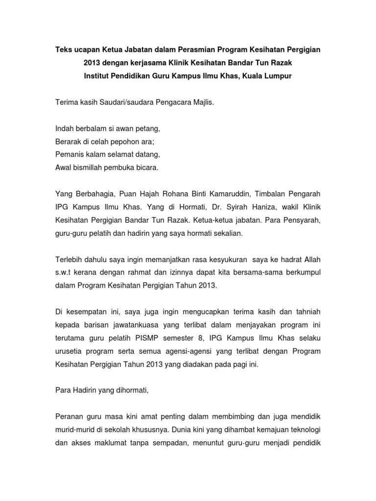 Teks Ucapan Majlis Perasmian