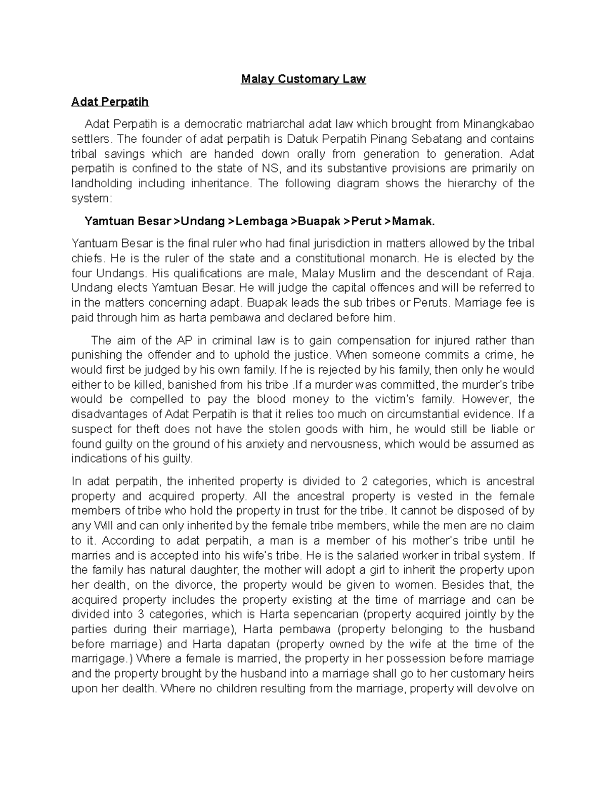 Adat Pepatih And Adat Temenggung Is The Malay Customary Law That Applicable To The Malays Studocu