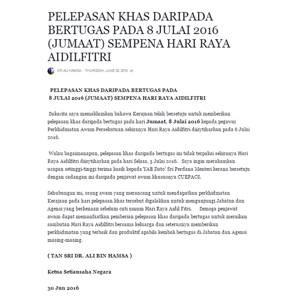 Cuti Peristiwa 8 Julai 2016 Pelepasan Khas Sempena Hari Raya Suhimi Nain