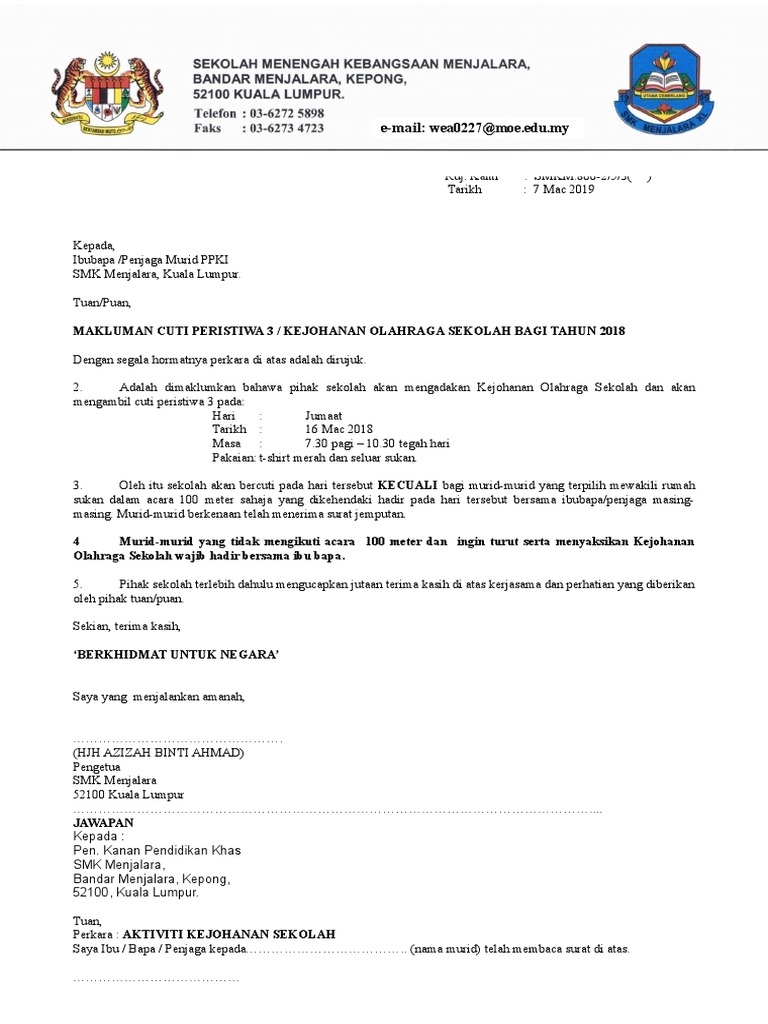 Makluman Cuti Peristiwa Sempena Kejohanan Sukan Tahunan Semestib 2018 Smk Seksyen 3 Bandar Kinrara