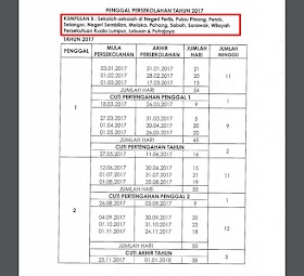 Takwim Kalendar Cuti Penggal Sekolah 2017