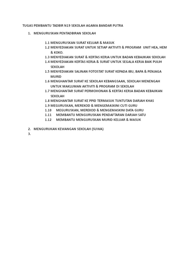 Senarai Tugas Pembantu Tadbir Perkeranian Operasi N19 Sekolah