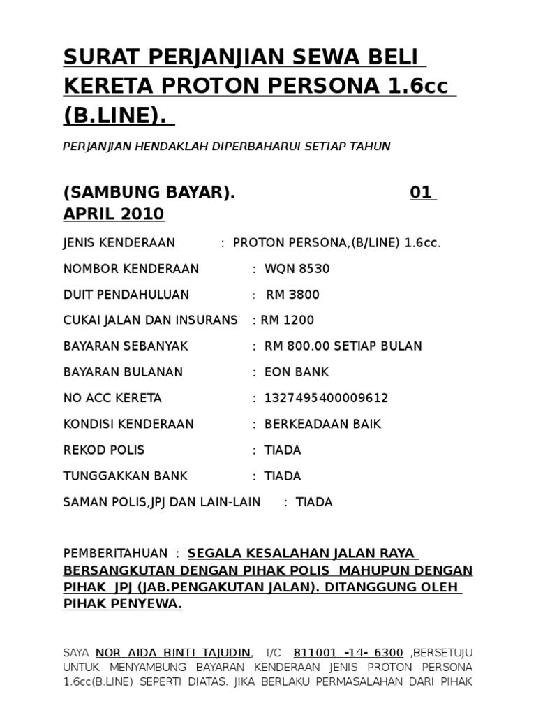 Surat Perjanjian Sewa Beli Kereta Proton Persona