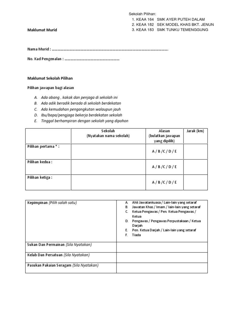 Borang Kosong E Daftar Menengah