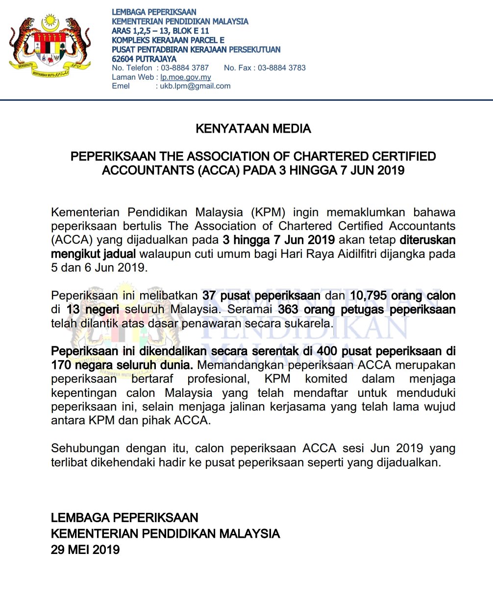 Kpm On Twitter Kenyataan Media Kementerian Pendidikan Malaysia Kpm Berkaitan Peperiksaan Bertulis The Association Of Chartered Certified Accountants Acca Pada 3 Hingga 7 Jun 2019 Chedetofficial Drwanazizah Maszlee Teonieching Mohdgazaliabas