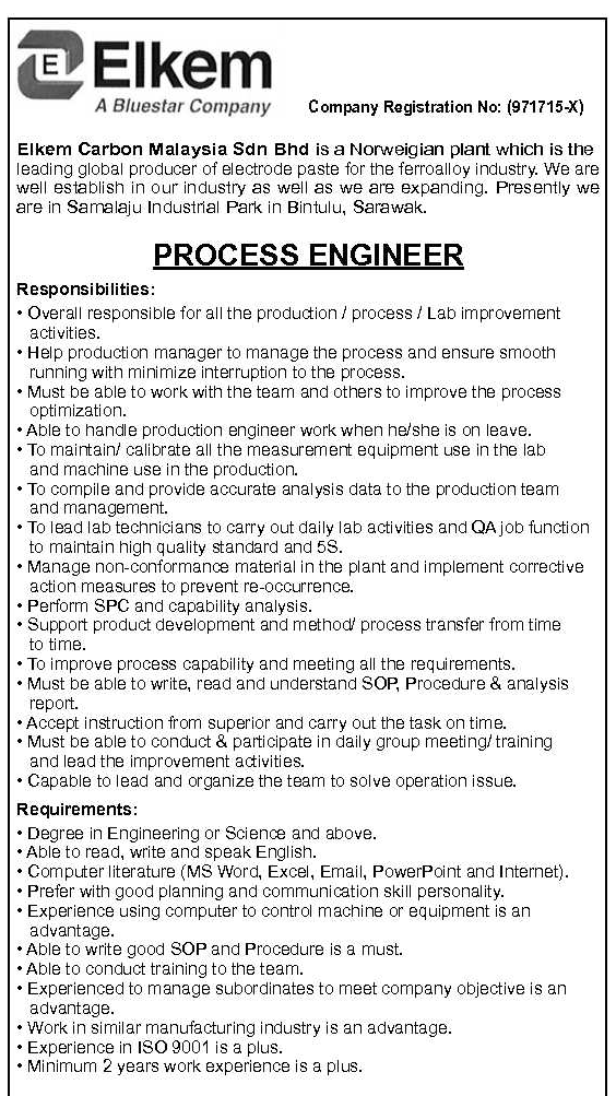 Oil Gas Vacancies Process Engineer Elkem Samalaju