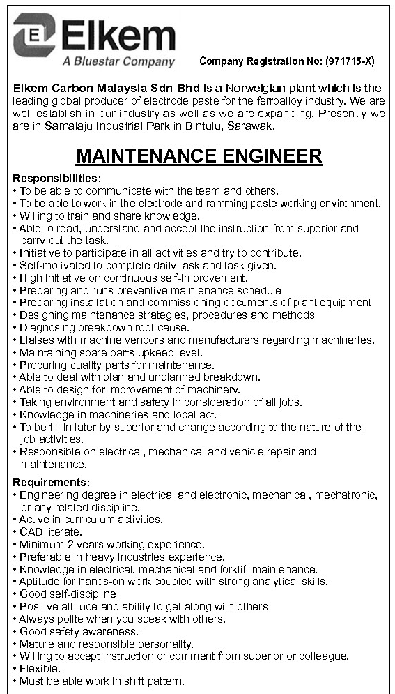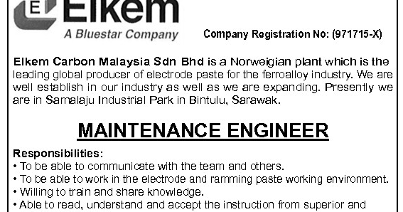 Oil Gas Vacancies Maintenance Engineer Elkem Samalaju