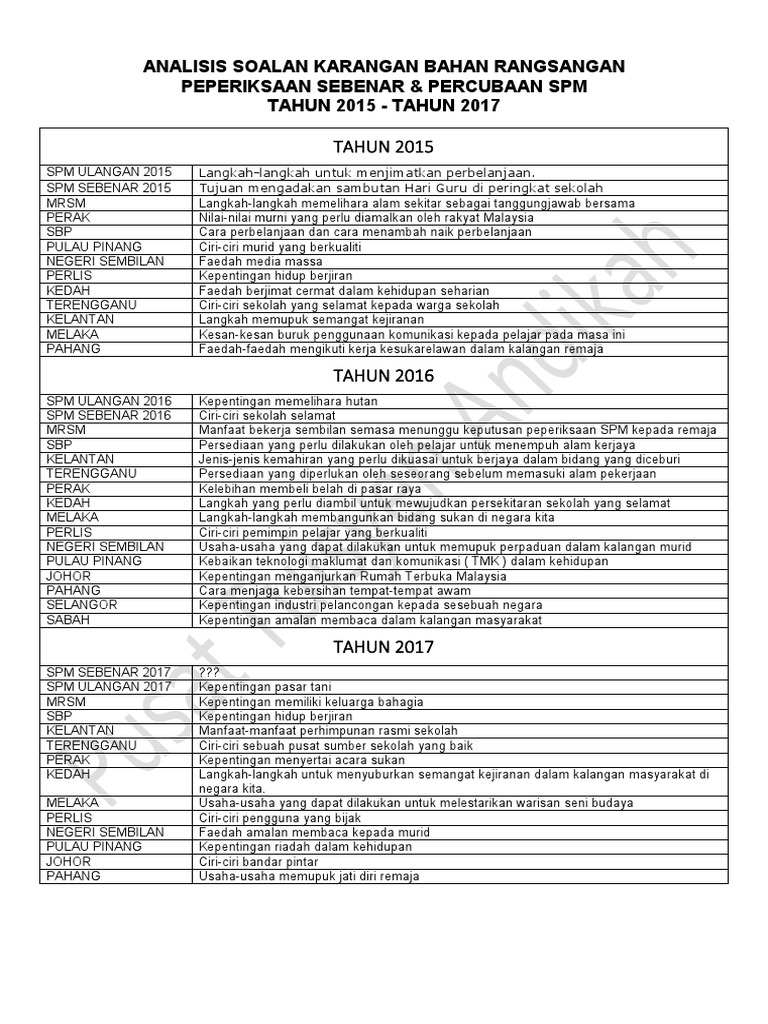 Analisis Soalan Karangan Bahan Rangsangan Peperiksaan Sebenar Percubaan Spm Tahun 2015 Tahun 2017