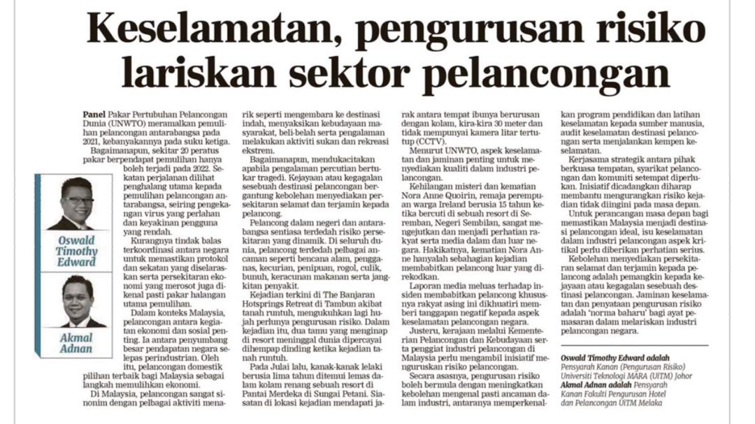Official Uitm Melaka On Twitter Artikel Akhbar Berita Harian 17 November 2020 Keselamatan Pengurusan Risiko Lariskan Sektor Pelancongan Oswald Timothy Edward Pensyarah Kanan Pengurusan Risiko Uitm Johor Akmal Adanan Pensyarah Kanan
