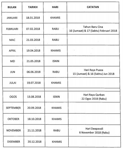 Jadual Pembayaran Pencen Pesara Kerajaan 2018